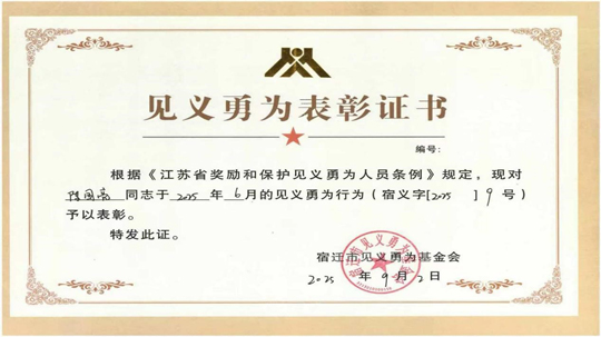 近日,園區(qū)蘇州公園工作人員陳國亮榮獲宿遷市見義勇為基金會“見義勇為”表彰。
