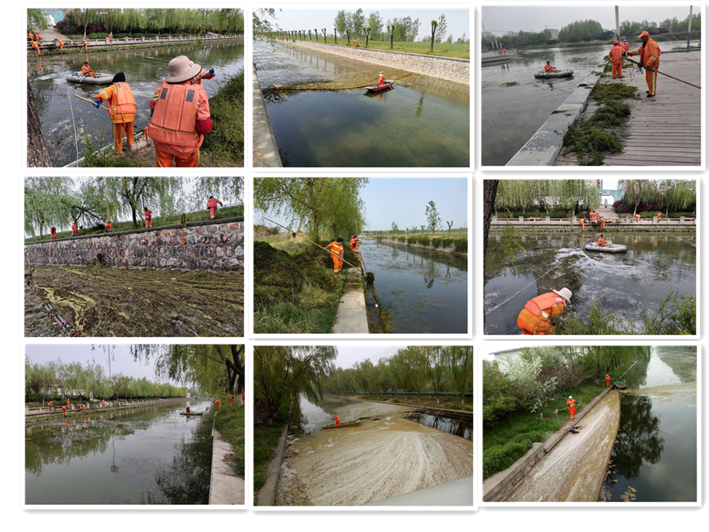加強河道水草清理力度,提升河道水環(huán)境、保河道暢通。4月初,河道水草大量繁殖,園區(qū)利民河、蔡莊大溝等河道滋生了大量水草,給河道保潔帶來極大難度,為了盡快完成河道水草打撈工作,公司組建了河道清撈隊,每天安排20名環(huán)衛(wèi)工人對河道進行集中打撈,尤其是針對蔡莊大溝水淺、駁岸高、工作量大等情況,積極探索、創(chuàng)新工作方法,采用了“機械先行,人工輔助”的作業(yè)模式,作業(yè)效率大幅度提升,預計4月25日前全面完成河道水草打撈,重現(xiàn)園區(qū)“碧波潺潺、河暢水美”的河道景觀。
